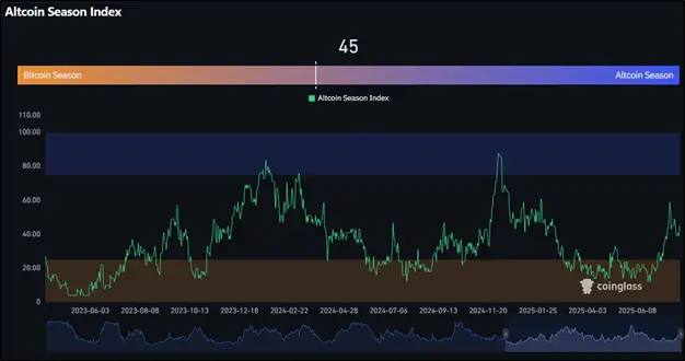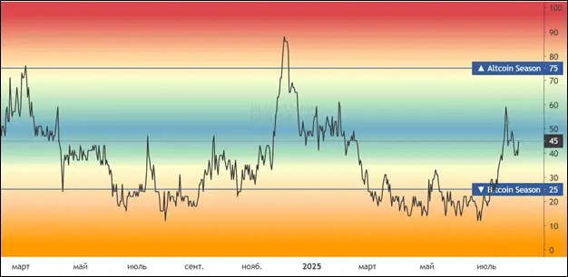 На самом деле — ни то ни другое. Индекс сезона альткоинов в июле 2025-го находится около своих средних значений. Портал Coinglass показывает, что индекс составляет 45. То есть, только 45% влиятельных монет показывают опережающую биткоин динамику. Стоит отметить, что Coinglass использует довольно сложную формулу для исчисления индекса. Помимо изменения цены учитываются рыночная капитализация, настроения в соцсетях, торговый объем и волатильность.