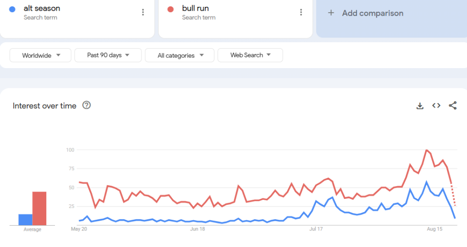 Ожидания инвесторов по поводу роста стоимости альткоинов не оправдались, и во второй половине августа криптовалютный рынок столкнулся с общим падением интереса к подобным цифровым активам. Частота поисковых запросов в Google по тегу «Сезон альткоинов» упала более чем на 50%.