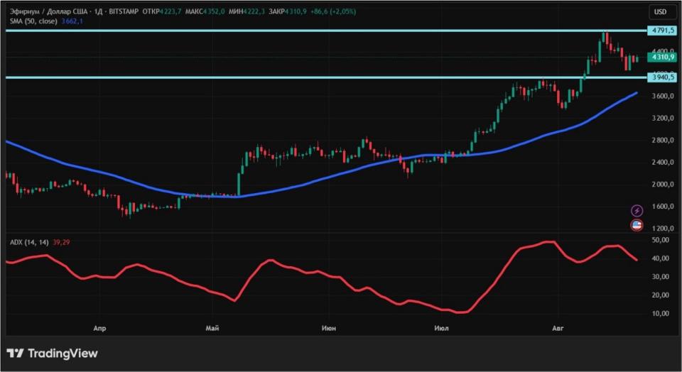 С точки зрения технического анализа, несмотря на снижение стоимости, эфир остается в восходящем тренде. Цена остается выше 50-дневной скользящей средней (обозначена синим цветом). Сила тренда несколько ослабла. Об этом говорит небольшое снижение индикатора ADX. Ближайшие уровни поддержки и сопротивления по дневному графику: $4791,5 и $3940,5 соответственно.
