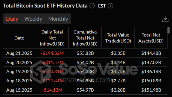 У спотовых ETF на биткоин наблюдается негативная динамика. Все торговые сессии биржевые фонды фиксировали отток денежных средств. Суммарно за неделю он составил $1,15 млрд. Настолько крупного недельного оттока денег не регистрировалось практически полгода. Последний раз более крупное изъятие денежных средств — $2,61 млрд — случилось в последние дни февраля 2025 года.