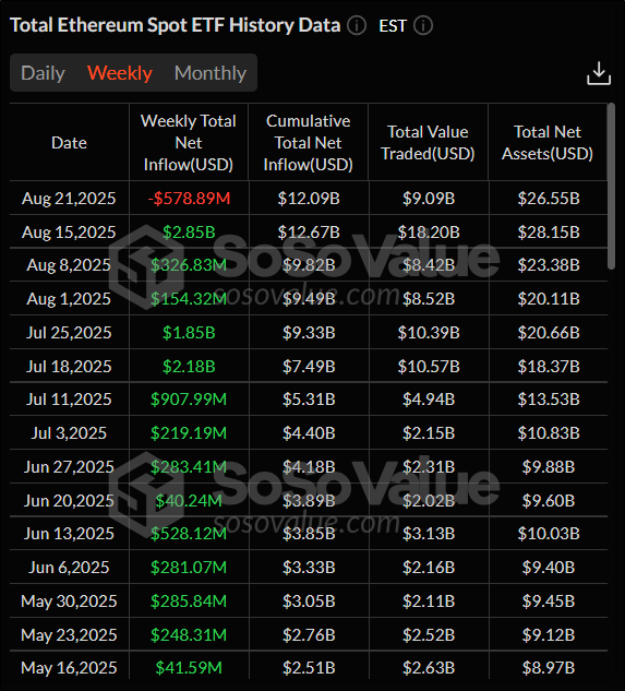 У спотовых ETF на эфир на неделе фиксируется отток денежных средств в размере более $0,5 млрд. Таким образом, серия непрерывного поступления денег в биржевые фонды прервана на 14-й неделе. Последний раз отток денежных средств из спотовых ETF на ETH фиксировался в начале мая.