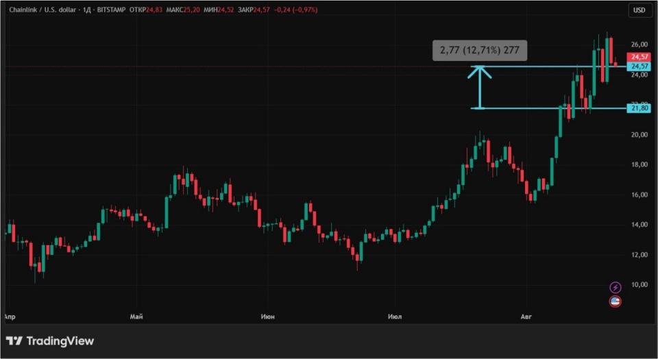 Стоимость криптовалюты Chainlink с 15 по 22 августа выросла на 12,77%. Неделя была отмечена серьезными колебаниями. Дважды, 17 и 20 августа, LINK дорожала более чем на 10% в течение одной торговой сессии. Достигнув на неделе отметки $26,88, Chainlink обновила свой максимум за семь месяцев.