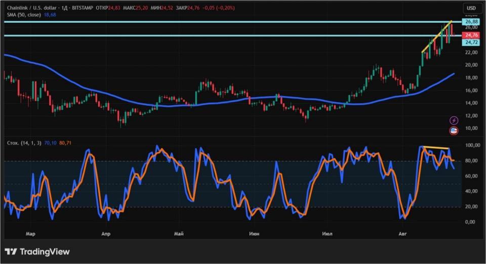С точки зрения технического анализа, Chainlink остается в восходящем тренде. Об этом свидетельствует расположение цены выше 50-дневной скользящей средней (обозначена синим цветом). А вот индикаторы подают тревожные знаки. Например, стохастик мало того что вышел из зоны перекупленности вниз, так еще и сформировал медвежью дивергенцию (отмечена желтыми линиями) — ситуацию, когда цена показала новый максимум, а значение осциллятора — нет. Оба этих сигнала обычно предвещают коррекцию, в связи с чем трейдерам нужно с осторожностью подходить к совершению сделок. Ближайшие уровни поддержки и сопротивления на дневном графике: $24,72 и $26,88 соответственно.