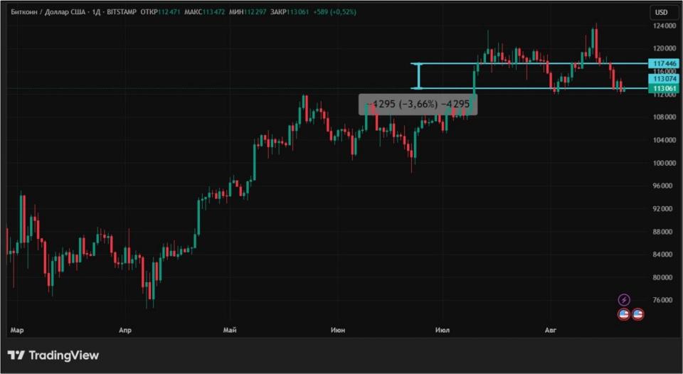 Биткоин с 15 по 22 августа 2025 года потерял 3,66%. На прошедшей неделе BTC не смог обновить исторический максимум, опустившись ниже $115 000. Волатильность при этом осталась относительно низкой: изменение цены ни разу за день не превысило 3%.