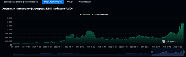 Торговая активность Chainlink наблюдается не только на спотовом рынке, но и на рынке деривативов. Показатель открытого интереса по фьючерсам у криптовалюты на прошедшей неделе впервые превысил $1,5 млрд. На пике он достигал $1,81 млрд. С начала года открытый интерес к Chainlink вырос более чем в три раза, что говорит о растущем интересе к инструментам на этот цифровой актив со стороны криптоспекулянтов.