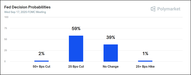 Портал прогнозов Polymarket наиболее вероятным считает снижение ключевой ставки американского центробанка на 0,25%. Шансы оцениваются в 59%.