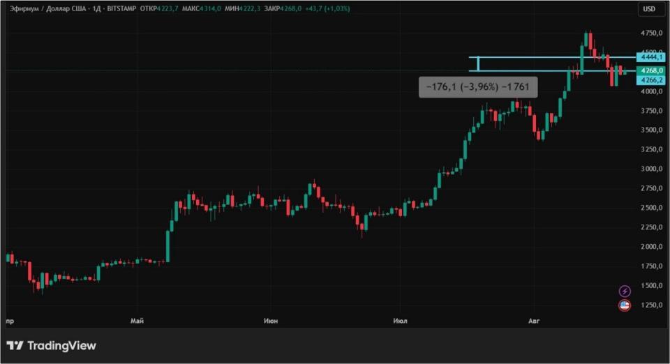 Эфир, как и биткоин, за неделю с 15 по 22 августа подешевел более чем на 3,5%. Вторая по капитализации криптовалюта пока так и не смогла обновить исторический максимум. Тем не менее, ETH продолжает торговаться выше психологически важной отметки $4000.