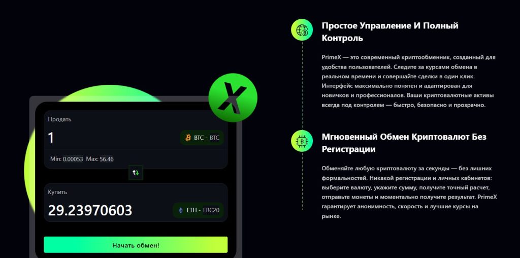 Одно из ключевых преимуществ PX1.pro — мгновенные крипто операции без необходимости создания аккаунта. Пользователю достаточно указать валюту, сумму и адрес кошелька — обмен происходит автоматически и занимает считанные минуты.