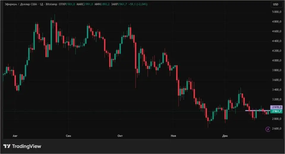 Эфир с 19 по 26 декабря тоже практически не изменился в цене. ETH по-прежнему торгуется чуть ниже психологически важной отметки $3000. Волатильность эфира оставляет желать лучшего. Лишь в одну торговую сессию 26 декабря дневное изменение превысило 2%.