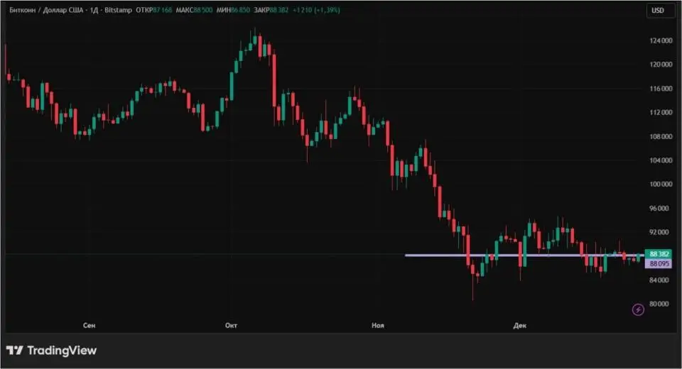 Цена биткоина с 19 по 26 декабря 2025 года фактически не изменилась. Крупнейшая по капитализации криптовалюта торгуется около $88000. Все семь торговых сессий были отмечены крайне низкой волатильностью: ни разу по итогам дня стоимость BTC не изменилась больше чем на 1,5%.