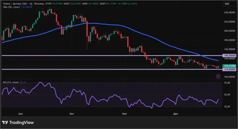 С точки зрения технического анализа, медвежий тренд Solana сохраняется с начала октября. Именно тогда цена опустилась ниже 50-дневной скользящей средней (отмечена синим цветом) и так с тех пор и не поднялась. Индикатор RSI так же не вселяет оптимизма, так как находится ниже значения 50. Ближайшие уровни поддержки и сопротивления на дневном графике: $116,86 и $146,93 соответственно.