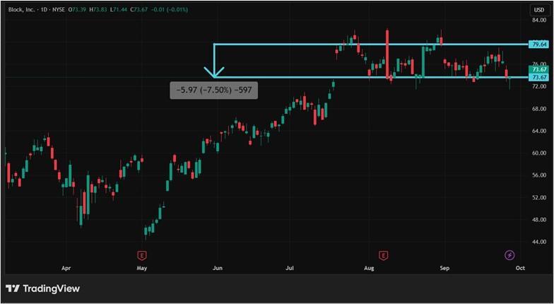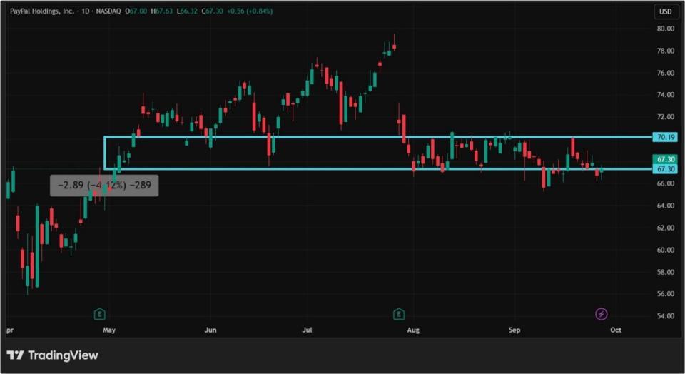 На четвертом месте расположился платежный сервис PayPal, предоставляющий возможность расплачиваться в криптовалютах, с капитализацией $64,29 млрд. В сентябре 2025 года его акции снизились в цене на 4,12%. Вот уже второй месяц подряд ценные бумаги PayPal торгуются в узком диапазоне между $67 и $70, редко выходя за эти границы. После того, как ФРС объявила о снижении ключевой ставки, акции компании перешли к снижению. Однако его размер оказался не критичным: цена спустилась от верхней границы боковика — $70 к нижней — $67.