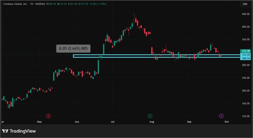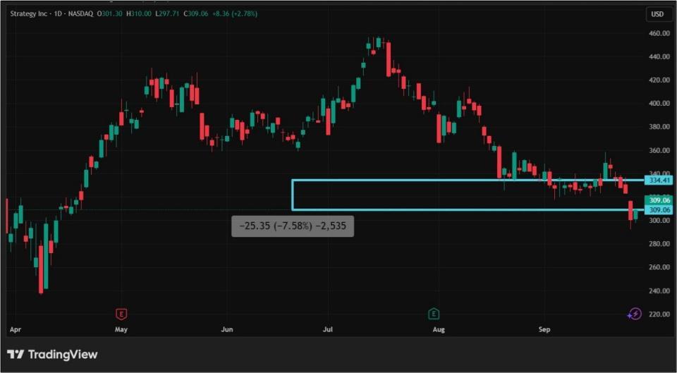Третье место занимает криптобиржа Coinbase с рыночной капитализацией $80,31 млрд. Ее акции в сентябре 2025 года выросли на 2,64%. Как и многие другие компании из списка, Coinbase показывала рост до объявления решения о ставке. После этого началось снижение. Во многом оно было связано с массовыми ликвидациями в криптовалюте, которые оказали влияние на отношение трейдеров и к акциям криптокомпаний.