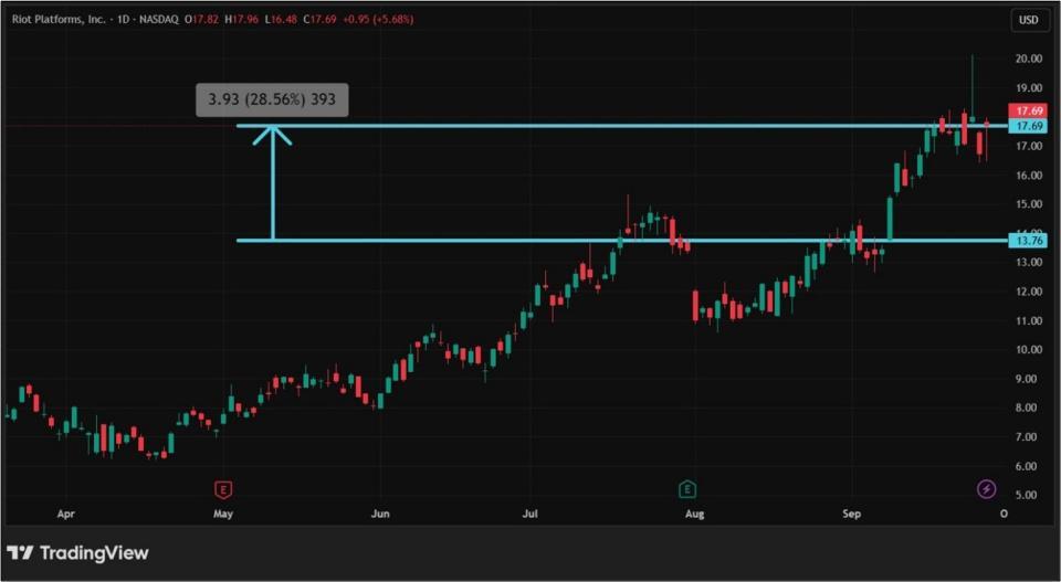 Еще одна майнинговая компания Riot Platforms занимает девятое место с рыночной капитализацией $6,53 млрд. Ее акции, в отличие от ценных бумаг MARA, продемонстрировали серьезный рост в сентябре 2025 года — 28,56%. Подъем явно замедлился после новостей о снижении ставки на 1%. Однако роста в первой половине месяца хватило для того, чтобы общая месячная динамика выглядела внушительной. Инвесторы больше доверяли Riot в сравнении с MARA, так как у этой компании более понятная модель развития бизнеса, связанная с добычей и реализацией BTC. Последняя вообще отказалась от реализации биткоинов в августе 2025 года. Riot же за последний месяц лета продала 450 BTC.