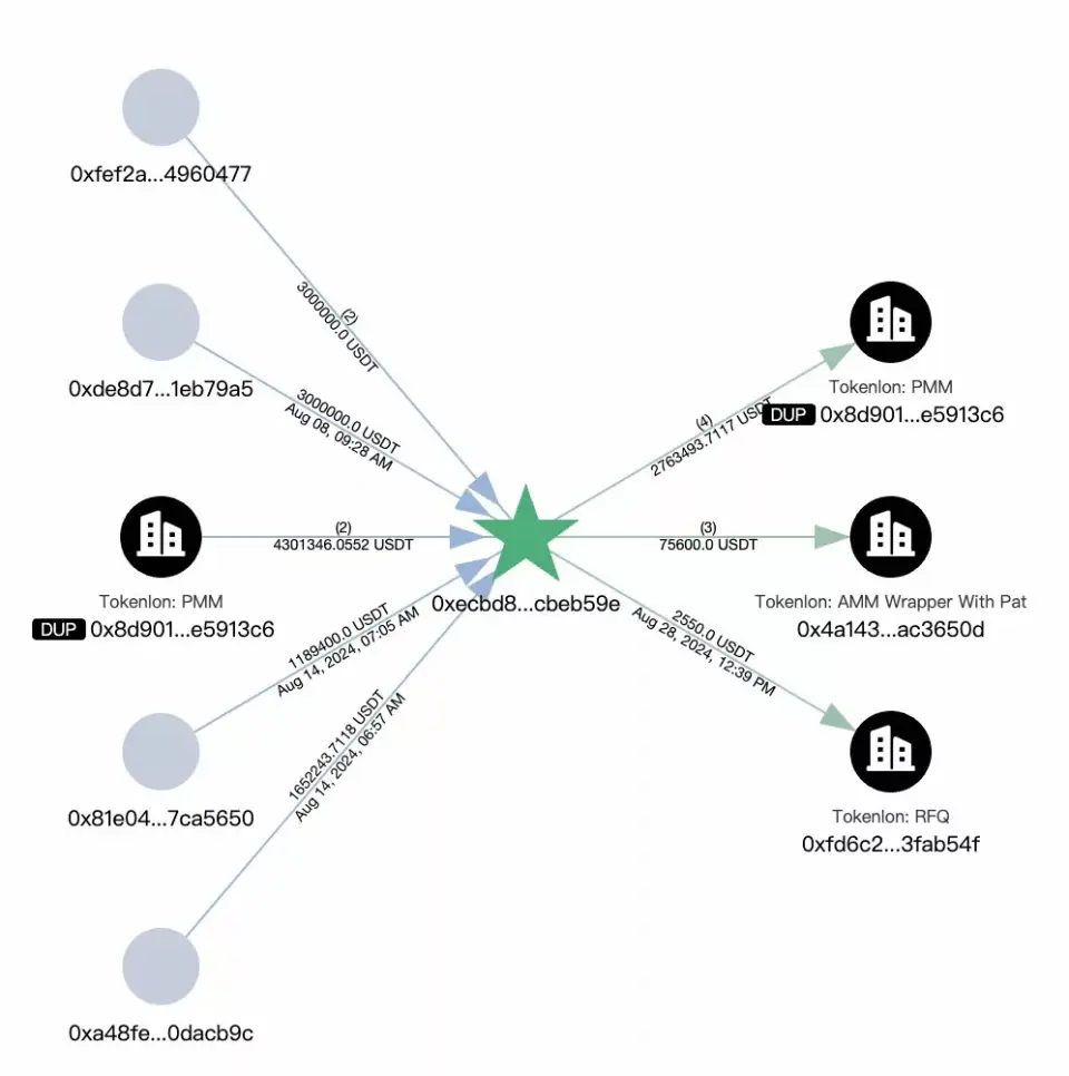 По данным аналитической платформы MistTrack, среди всех заблокированных аккаунтов выделяются два адреса:: 0xecbd85e318e83f0358b404b41fb73daaacbeb59e с балансом в $10,3 млн USDT и TRON-адрес TYzDebkjMofvfWR6v7Ay1rcH7r9JjYMxQV с балансом в 1,4 млн USDT.